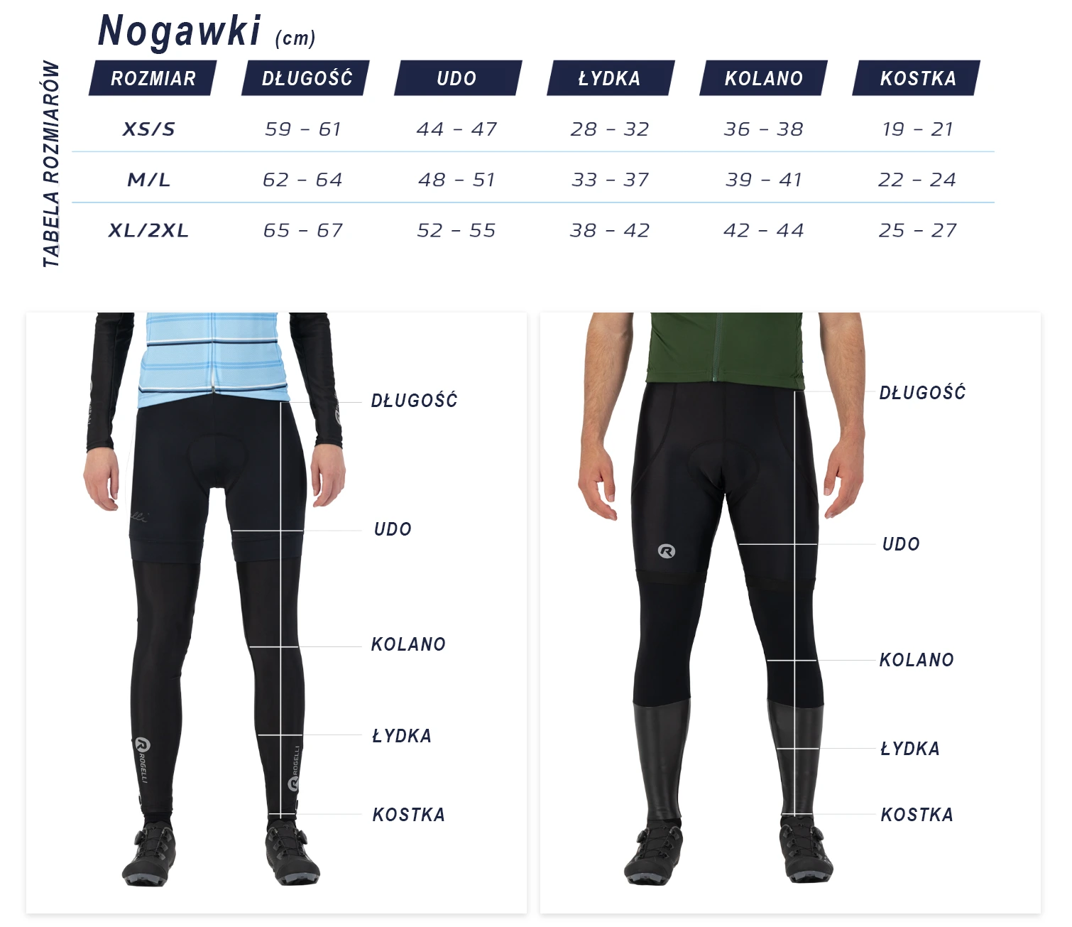 - WSKAZÓWKA Pamiętaj, że nogawka i spodenki kolarskie powinny na siebie nachodzić (na ok. 3-10 cm), aby zapewnić idealne dopasowanie.