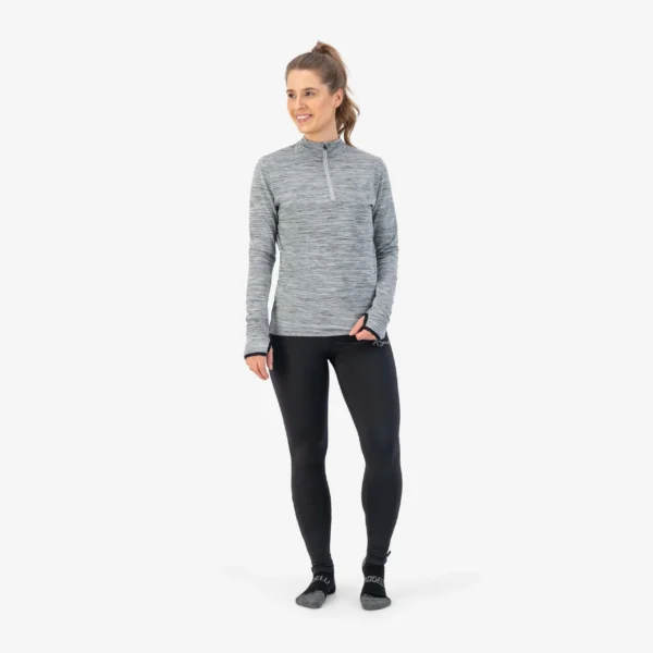 Dodatkowym atutem są otwory na kciuki, które zapewniają komfort oraz ciepło. Z przodu krótki zamek błyskawiczny z elementem chroniącym szyję, który ułatwia ubranie koszulki. Bezpieczeństwo podczas biegania jest bardzo ważne. Specjalne odblaskowe elementy umieszczone na koszulce sprawiają, że będziesz widoczna nawet w ciemności.