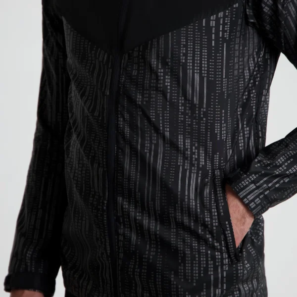 Wiatroodporna kurtka (Green-R) z materiału Eco Airbloc. Posiada odblaskowy nadruk 360 stopni oraz powłokę DWR. Wyposażona w tylny otwór wentylacyjny, 2 kieszenie boczne i regulację na rzepy/pas.