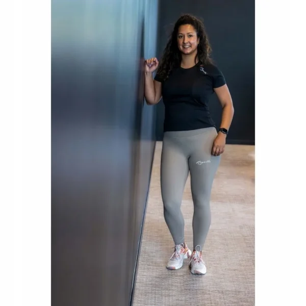 Wygodne i stylowe legginsy z wysokim stanem (Nylon/Elastan), idealne do biegania, fitnessu czy jogi. Wysoki, dwuwarstwowy pas zapewnia optymalne wsparcie w talii i posiada ukrytą kieszeń z tyłu na telefon. Legginsy mają minimalistyczny krój z minimalną liczbą szwów z przodu.