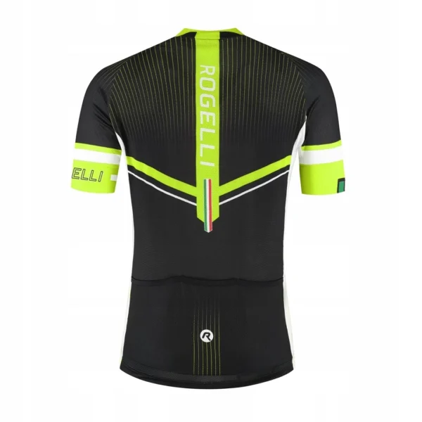 Męska letnia koszulka kolarska z włoskiej kolekcji Rogelli. Wykorzystany materiał Golf zaprojektowano specjalnie z myślą o wysokich temperaturach – doskonale odprowadza pot na zewnątrz dzięki delikatnej strukturze tkaniny. Zamek na całej długości koszulki ukryto pod materiałem i zakończono niską stójką pod szyją.
